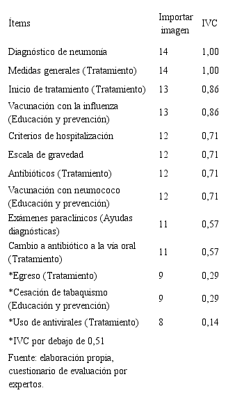 Una vez diseñado el instrumento de GPC NAC (guía de práctica clínica de neumonía) se realizó una prueba piloto en 14 profesionales de salud expertos entre médicos neumólogos, internistas, infectólogos, intensivista, auditores en salud para la validación de contenido, realizándole los respectivos ajustes; la Validez del instrumento estadísticamente, se basó en una medida del grado de exactitud.. En este caso, se aplicó el método del índice de validez de contenido (IVC), que consistió en la valoración por parte de un grupo de personas con calificación técnica en el tema de los ítems en tres categorías que son: innecesario (1), útil (2) o esencial (3), al cual se le consideran expertos y se calculó el índice, así: