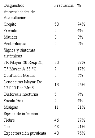 Con respecto a las características clínicas para el criterio de diagnóstico, se evidenció que el signo característico de esta patología estuvo representado en mayor índice por anormalidades en la auscultación con el signo de crepito, 94%, seguido de 57% con signos y síntomas sistémicos como la frecuencia respiratoria mayor a 20 resp x’, acompañado del 91% de tos y 87% de temperatura mayor a 38°C; comparando las características clínicas de los pacientes del estudio son similares con el estudio de Báez SR. et al.,15 que se presentaron la misma sintomatología en ambos estudios.
