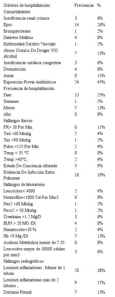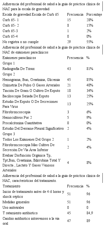 Materials and methods: A cross-sectional descriptive study was carried out, the sample consisted of 53 clinical records of patients who met the inclusion criteria, such as: diagnosed with NAC, in the period from January to December 2016, of any gender and older than 18 years considering the study variables: sociodemographic characteristics, clinical characteristics, diagnostic aids, hospitalization criteria, severity scale, diagnosis and treatment.
