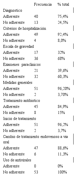Estudio sobre cumplimiento de las guías nacionales en pacientes hospitalizados con NAC5, concluyó que el tratamiento administrado dentro de las 8 horas de la admisión fue óptimo, y el resto de los indicadores mostraron un bajo nivel de cumplimiento; así mismo, que existen muchas áreas en el manejo de las NAC que no se efectúan de acuerdo a las guías nacionales de la Sociedad Venezolana de Neumología y Cirugía Torácica (OVETHORAX).
