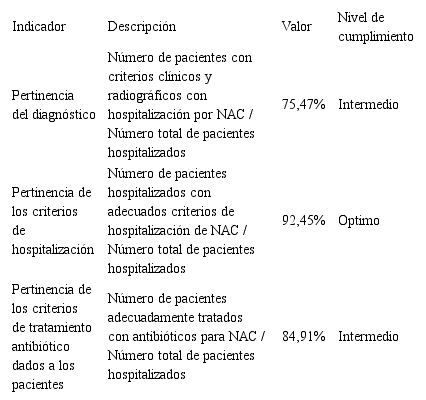 Por otro lado, el nivel de cumplimiento de los profesionales de la salud en los indicadores de calidad de la guía de NAC en adultos hospitalizados en la ESE, es muy variable. Los resultados del presente estudio es que se debe mejorar el registro y la documentación en la historia clínica.
