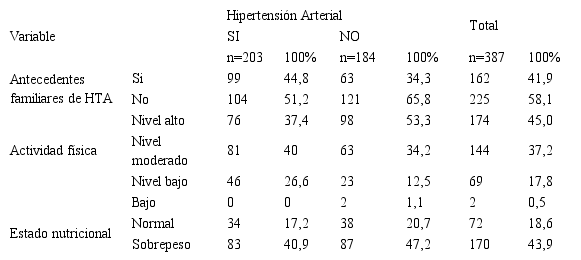 Methodology: a descriptive study was carried out in 378 older adults. It was considered hypertensive after two blood pressure measurements taken at least one week apart, in which the systolic blood pressure was greater than or equal to 140 mmHg and diastolic blood pressure greater than or equal to 90 mmHg. Hypertensive people were characterized according to sociodemographic parameters, family history, nutritional status and physical activity. For the sampling, census areas of each parish were used, with simple random sampling. The data were analyzed and processed in the SPSS program version 15.0, using frequency distribution, measures of central tendency: mean and dispersion measures: standard deviation.