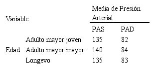 Las presiones arteriales promedio de acuerdo a la edad tuvieron la media mayor en el grupo de adulto mayor mayor con 140/84 mmHg (tabla 4).
