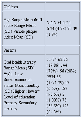 Statistical Analysis: Data obtained was analysed using SPSS version 22. Pearson correlation test was used to prove the association between parental OHL (measured by REALD-99) and the oral health status of the preschool children (using two parameters: The dmft and visible plaque index (VPI)). Independent t-test was utilised to compare the means of the dmft and VPI of two groups of children, namely those with high parental OHL and those with low parental OHL.