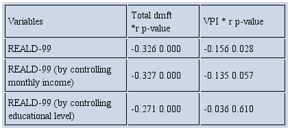 Significant correlation between REALD-99 and dmft, r = -0.271 (p = 0.000) is seen when controlling the educational level. As the value of REALD-99 increases, the dmft decreases and when adjusting for educational level, there is influence on dmft. Meanwhile, there is no significant correlation between REALD-99 and VPI when controlling educational level as p = 0.613, which is > 0.05.