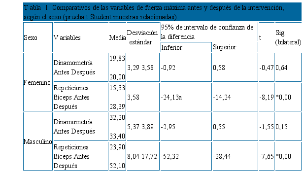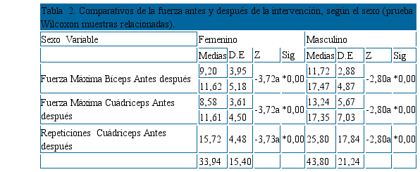 Al comparar la fuerza, se observan cambios estadística- mente significativos para ambos sexos en las pruebas de fuerza máxima de bíceps, fuerza máxima de cuádriceps y repeticiones de cuádriceps. Este aumento porcentualmente fue del 25%, lo que pone en evidencia lo establecido en diferentes estudios sobre los efectos del programa de intervención acorde con el tiempo del mismo.