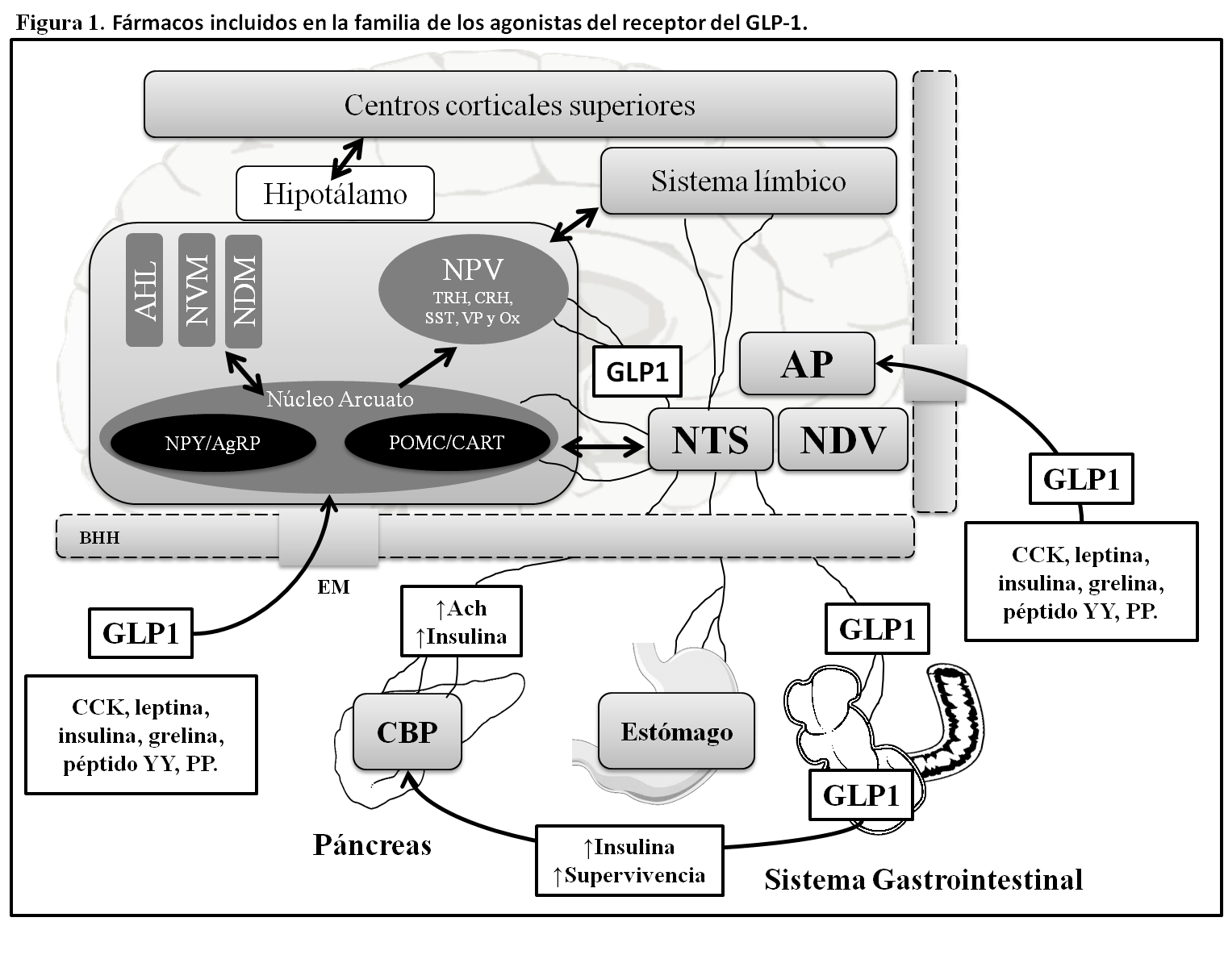 En el sistema nervioso central, el GLP-1 se encarga de regular el apetito y disminuir la absorción intestinal por retraso del vaciamiento gástrico, actuando a nivel del hipotálamo y en el nervio vago, uniéndose a su receptor activando la señalización dependiente de las MAPK cinasas y modulando la actividad de los canales de Ca2+ 22. El GLP-1 derivado del cerebro es producido principalmente en neuronas del área caudal del núcleo del tracto solitario, que proyectan sus terminaciones nerviosas hacia el núcleo paraventricular y estimula la secreción de la CRH para promover un efecto anorexígeno23. A su vez, interviene motilidad gastrointestinal por medio de eferencias vagales, retardando el vaciamiento gástrico por aumento de la motilidad pilórica y la relajación gástrica24.