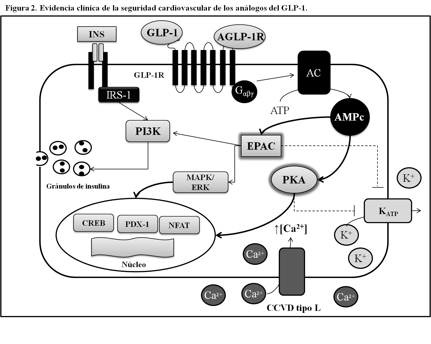 El efecto secretagogo del GLP-1 es dependiente de la actividad de los canales de K. dependientes de ATP (KATP), potenciando la respuesta de estos al incremento citosólico del ATP que ocurre frente al metabolismo de la glucosa (por lo que se considera un efecto glucosa-dependiente), con la subsecuente despolarización de la célula y apertura de los canales de Ca2+ voltaje dependientes. Este mecanismo de acción es mediado por la unión con el GLP-1R, aumentando la concentración de AMPc y activando a dos proteínas efectoras: la PKA y la EPAC, las cuales actúan inhibiendo a los canales KATP y los canales K. 27. Asimismo, el GLP-1 promueve la proliferación y supervivencia de la CBP, activando la vía de señalización de la PI3K/Akt/mTOR, fosforilando al factor de transcripción FoxO1, excluyéndolo del núcleo y estimulando al PDX-1, aumentando la masa pancreática al promover la proliferación celular, la neogénesis y disminuir la apoptosis28. En cambio, el GLP-1 inhibe la secreción de glucagón de forma directa, ya que se conoce la presencia del GLP-1R en la célula alfa pancreática, y de forma indirecta al estimular la secreción de insulina y somatostatina29.