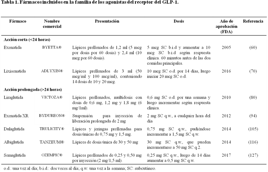 El primer agonista del receptor de GLP-1 fue la exendina-4, péptido natural de 39 aminoácidos aislado de secreciones salivales del reptil Heloderma suspectum con un secuencia homóloga del 53% del péptido nativo. Una característica farmacocinética de este agonista del GLP1-R fue su mayor vida media de aproximadamente 2,4 horas, debido a que su penúltimo residuo del extremo N-terminal es glicina y no alanina, lo que confería resistencia a la DPP-IV59. En la actualidad, esta familia farmacológica está compuesta de diversos fármacos aprobados tanto en Estados Unidos como en Europa, siendo clasificados en dos grupos: de acción corta (<24 horas) y de acción prolongada (>24 horas), Tabla 1.