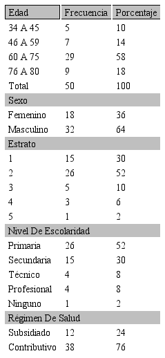 En la descripción de las características socio demográfica de la muestra se encontró que la edad mínima registrada fue de 34 a 40 años y la edad máxima dentro de la población fue de 76 a 80 años, con una media de 65 años, respecto a la variable de sexo de los pacientes con ERC encuestados, se observó que el 64% de la población es masculina y el 36% es femenino. Así mismo se observa que la mayoría de los pacientes con ERC se encuentran en los estratos uno y dos con una distribución porcentual del 30% y el 52% respectivamente. A nivel de la escolaridad se logró evidenciar que el 52% de los pacientes tiene un nivel académico básico (primaria) y el 30% pertenece a secundaria. Adicionalmente el 76% de los pacientes se encuentran vinculados al régimen contributivo (ver tabla 1).