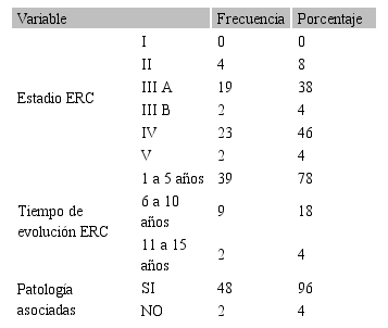 Dentro del estadio de la ERC se observó que el 46% de la población se encuentra en el estadio IV de su enfermedad, de igual manera se observó que el 38% de la población se encuentra en el estadio 3A. Es decir, presentan una moderada disminución del filtrado glomerular. Así mismo se reportó que el 78% de la población presenta un tiempo de evolución de haber sido diagnosticado con ERC de aproximadamente de 1 a 5 años y el 96% presentan patologías asociadas a la ERC (ver tabla 2).