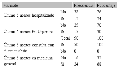 Por otra parte, el 76% de los pacientes con ERC encuestados no habían sido hospitalizados durante los últimos seis meses, así mismo el 70% no ingreso al servicio de urgencias durante los últimos seis meses, el 100% de los encuestados manifestó haber tenido cita con el especialista durante los últimos seis meses, sin embargo el 68% de la población había requerido cita por medicina general (Ver tabla 3).