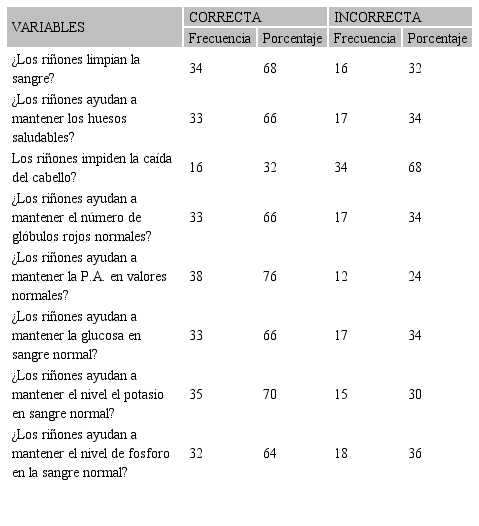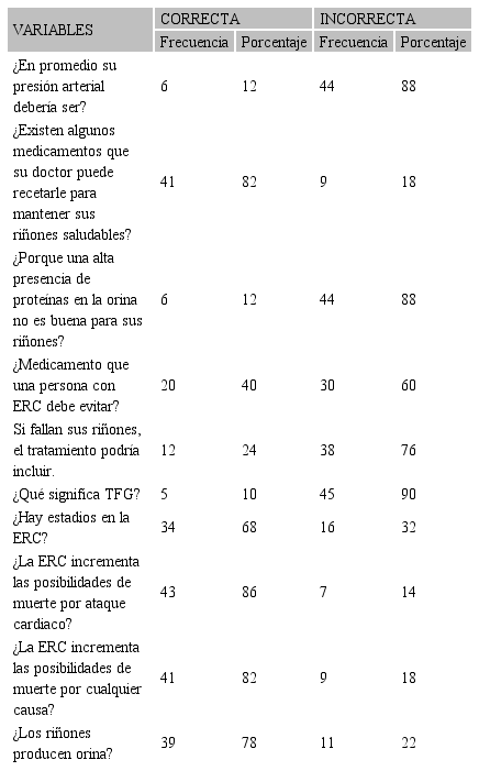 Con respecto al conocimiento relacionado con su enfermedad, el 88% desconoce el promedio normal de su presión arterial, de igual manera no conocen el significado que tiene la presencia alta de proteínas en la orina sobre los riñones, el 60% respondió incorrectamente con respecto a los medicamentos que debe evitar consumir, el 60 % no identifican el tipo de tratamiento que deben incluir si fallan sus riñones, el 90% presenta desconocimiento del significado de la tasa de filtrado glomerular (ver tabla 4).