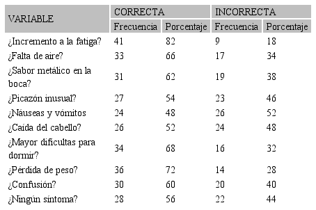 Con respecto al nivel de conocimiento que tienen los pacientes con ERC, a cerca de los síntomas relacionados con su enfermedad, el 82% de las personas reconocen que el ERC incrementa la fatiga, así mismo el 66% identifica que la ERC incrementa la falta de aire, el 54% reconoce que la ERC genera picazón inusual, el 52% respondieron correctamente con respecto a que la ERC genera la caída del cabello, de igual manera una mayor proporción de paciente con ERC logra identificar que la ERC genera mayor dificultad para dormir, pérdida de peso y confusión (ver tabla 6).