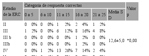 Por último, al analizar la relación entre el estadio de los pacientes con ERC y la categoría de respuesta correcta que obtuvo la población encuestada, observamos que existe una asociación estadísticamente significativa entre ambas variables (p=0,00), donde el 26% de los pacientes en estadio IV, respondieron entre 11 a 15 preguntas correctas (Ver tabla 7).
