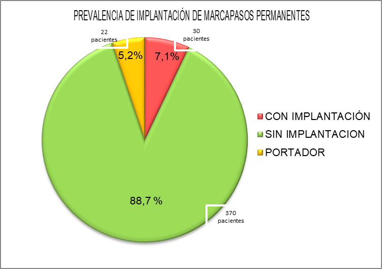 La prevalencia de la implantación de marcapasos fue de 7,1% y se asoció a bloqueo aurículo ventricular como principal factor de riesgo, seguido de enfermedad del nodo y otros.