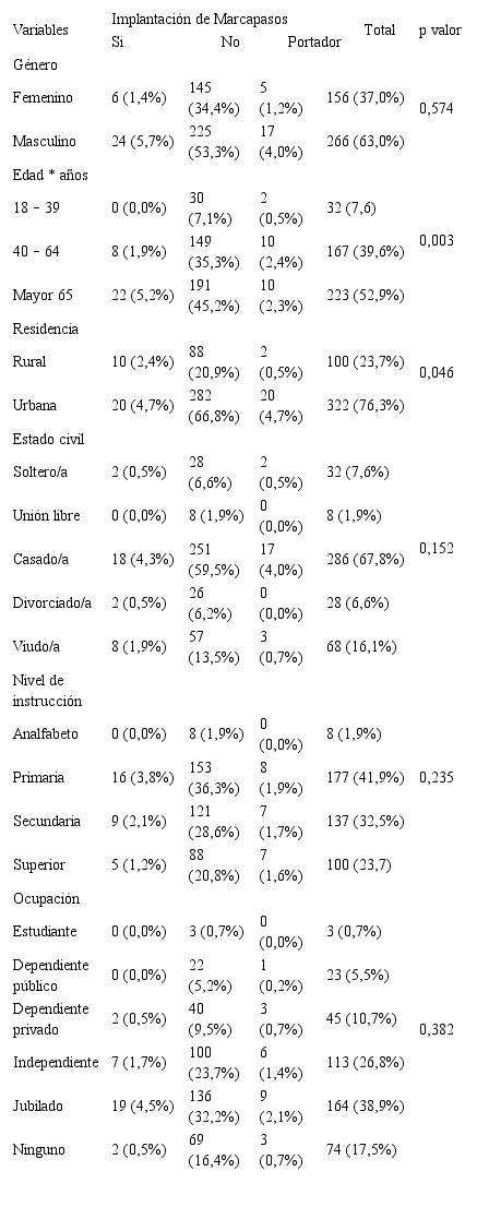 En relación a las variables sociodemográficas en la implantación de marcapasos se observó que prevaleció el sexo masculino 266 (63,0%), de los cuales 5,7% se les implanto marcapasos permanentes. La media de edad fue 65,52±14,77), más de la mitad de los pacientes corresponden a adultos mayores 223 (52,9%), y de estos el 22 (5,2%) se les implantó marcapasos permanentes. Hubo predominio de pacientes con residencia urbana 322 (76,3%). Según el estado civil el grupo más frecuente corresponde a la categoría de casados el 286 (67,8%). La instrucción predominante fue la primaria 177(41,9%), de los cuales a 16 (3,85%) se les implanto marcapasos permanentes. Finalmente, la ocupación más frecuente fueron los jubilados 164 (38,9%), y un 19 (4,5%) de los mismos requirieron implantarse dicho dispositivo. (Tabla 1).