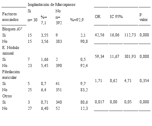 Results: the prevalence of pacemaker implantation is 7.1%, its mean age 65.52 (SD ± 14.77), the male sex predominated. The risk factors associated with pacemaker implants were: atrioventricular block OR 42.56 (95% CI: 16.06 - 112.73, p = 0.000); sinus node disease OR 59.34 (95% CI: 11.67 - 301.93, p = 0.000) and other OR 0.017 (95% CI: 0.00 - 0.05, p = 0.000). Atrial fibrillation had an association but no statistical significance OR 1.71 (95% CI: 0.62-4.71, p = 0.354).