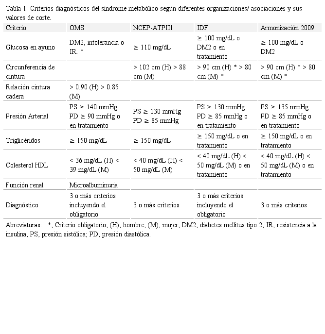 Según la Organización Mundial de la Salud (OMS)5,6, el Programa Nacional de Educación Sobre el Colesterol - Panel III de Tratamiento de Adultos (NCEP-ATPIII)7-9, la Federación Internacional de Diabetes (IDF)10,11 y la Armonización de IDF/AHA/NHLBI/WHF/IAS/IASO del 2009., se establecen como componentes principales del síndrome metabólico la presencia de tres o más alteraciones12-14, de acuerdo con las variables resumidas en la Tabla 1.
