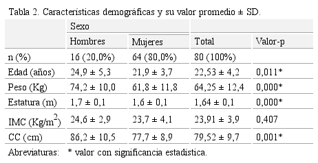 La muestra fue de 80 estudiantes; 16 hombres (20,0%) y 64 mujeres (80,0%). La edad promedio fue de 22,53 ±4,18 años, con un rango desde 17-32. Las características demográficas se muestran en la Tabla 1. La media aritmética del IMC fue de 23,91 ± 3,9 kg/m2 (24,6 ± 3,9 en hombres y 23,7 ± 4,1 en mujeres), mientras que la media de la circunferencia de cintura (CC) fue de 79,52 ± 9,7 cm (86,2 ± 10,5 cm en hombres y 77,7 ± 8,9 cm en mujeres).