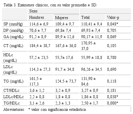 También se encontró para los mismos grupos, diferencia significativa (p<0,05) en las variables clínicas PS, LDLc/HDLc y TG/HDLc (Tabla 3).