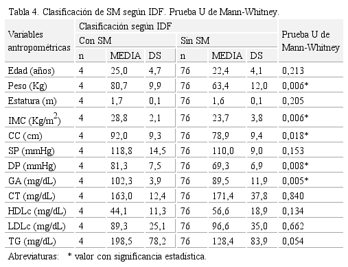 Design and method: the descriptive, cross-sectional research was conducted with a sample of 80 students (16 men and 64 women) between the ages of 17 and 32, apparently healthy. Using the International Diabetes Federation (IDF) definition for SM, variables such as waist circumference (WC), systolic and diastolic blood pressure (SP, DP), fasting glucose (FG), HDL cholesterol (HDLc) and triglycerides (TG) were measured. For statistical analysis, comparison between groups was performed with the non-parametric Mann-Whitney U test, with a significance level of p<0.05 and using the statistics program used was SPSS see 24.