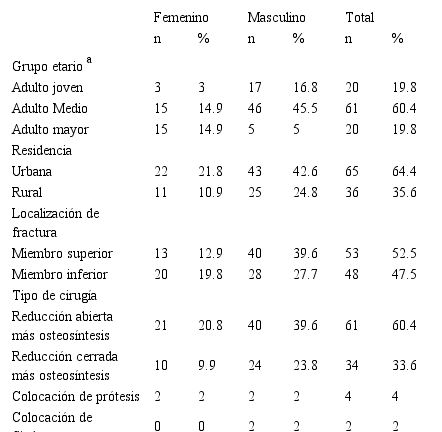 El presente estudio estuvo constituido por 101 individuos, de los cuales el 67.3% correspondió al sexo masculino y el 32.7% al sexo femenino. Se evidenció que un 64.4% de pacientes que ingresan a esta casa de salud pertenecen a la zona urbana y el 35.6% a la zona rural. Un mayor número de fracturas se presentó en miembros superiores 52.5% en referencia a los miembros inferiores los cuales fueron afectados en el 47.5%. La cirugía de reducción abierta más osteosíntesis predominó en comparación con la reducción cerrada más osteosíntesis, colocación de prótesis y fijadores externos, Tabla 1.