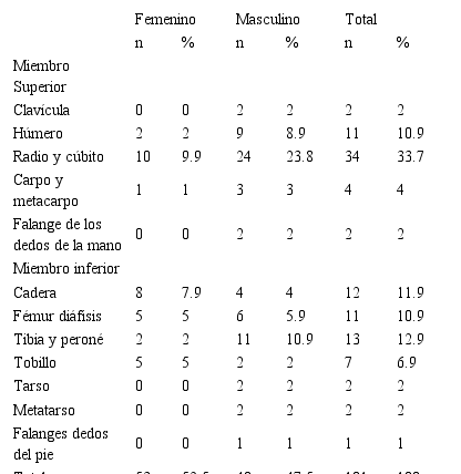 Respecto a la localización de las fracturas, las más frecuentes se presentaron a nivel de cúbito y radio (radio distal) con el 33.7%, seguidas de las fracturas a nivel de tibia y peroné presentados en el 12.9% de los casos, Tabla 2.