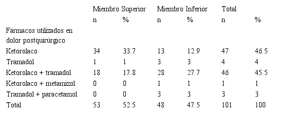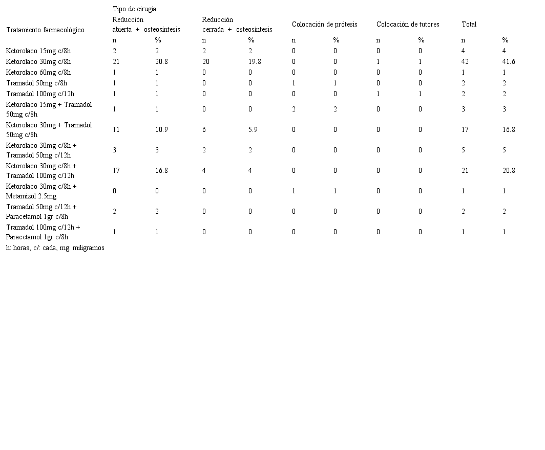 Results: 101 cases were evaluated of which 67.3% were represented by the male sex and 32.7% by the female, 52.5% of the fractures were found in the upper limbs and 47.5% in the lower ones, the location most frequent was the radius and ulna, the predominant surgery was the open reduction of osteosynthesis with 60.4% of the cases, the most used analgesic treatment was ketorolac (93%), either as monotherapy 46.5% or associated to other drugs such as tramadol or metamizole 46.5%. The most used combination was ketorolac plus tramadol 45.5%. Of the total combined analgesic prescriptions, 49.5% use two analgesics as therapy. Tramadol was used in more than half of the 52.5% prescriptions, either as monotherapy or combined.
