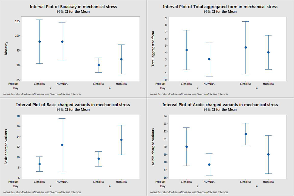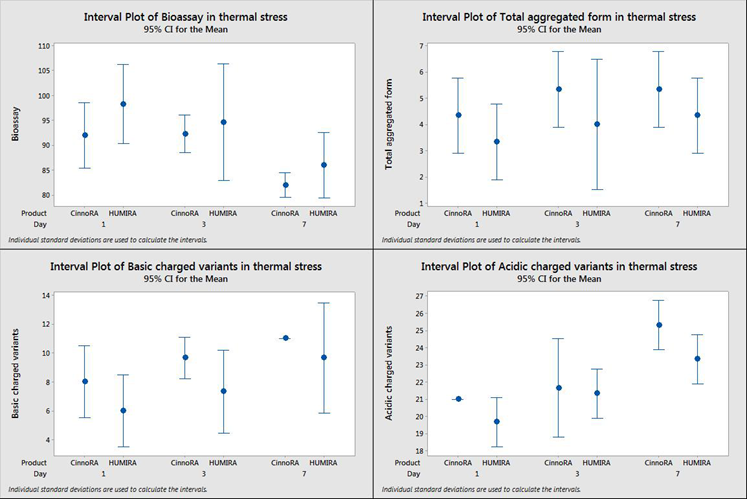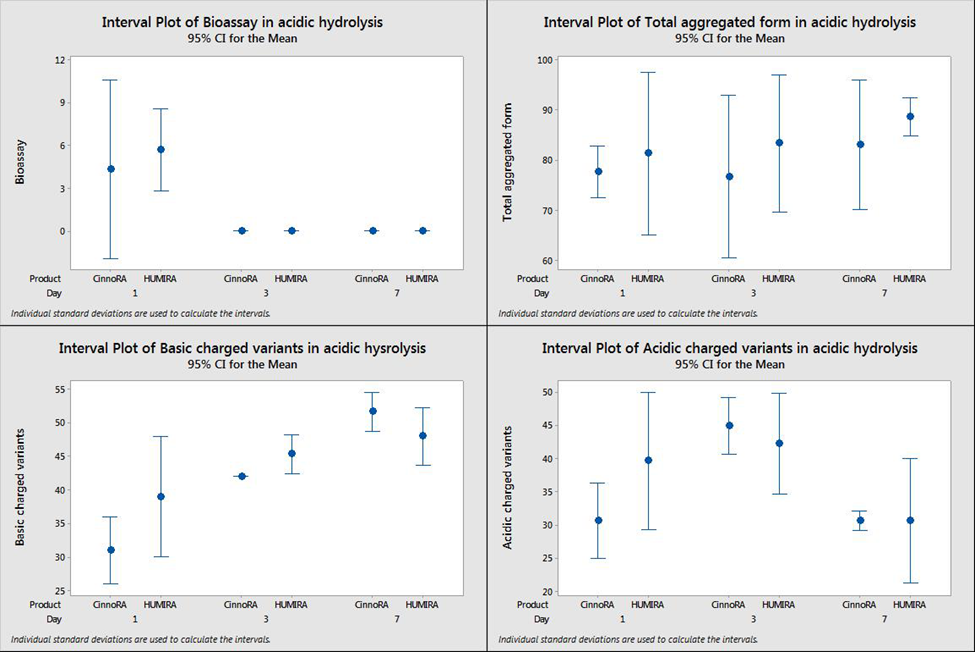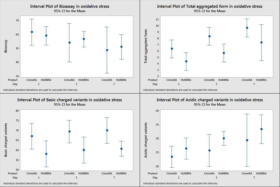 The results of detected parameters in photolytic condition as representative data shown in (table 2). The results analyzed by minitab ANOVA interval plot in Figure1,2 and 3 which illustrate no significant difference of bioassay, aggregated forms and acidic/basic charged variants between Cinnora® and Humira® in all 1,3 and 8 days.