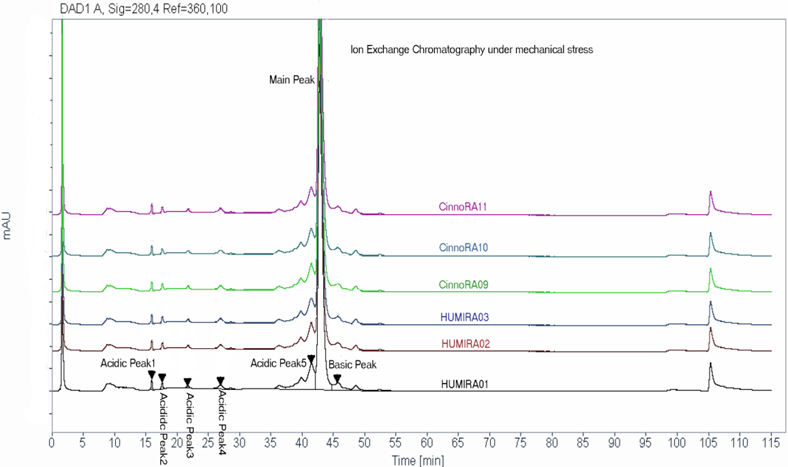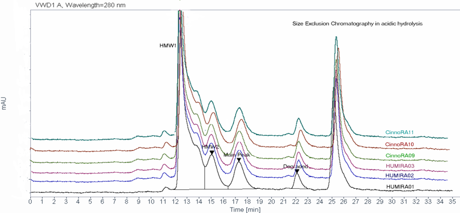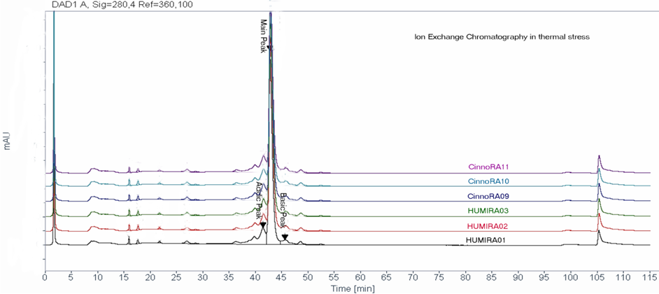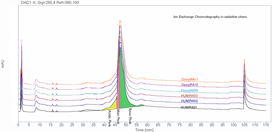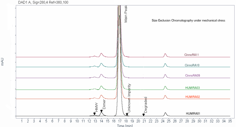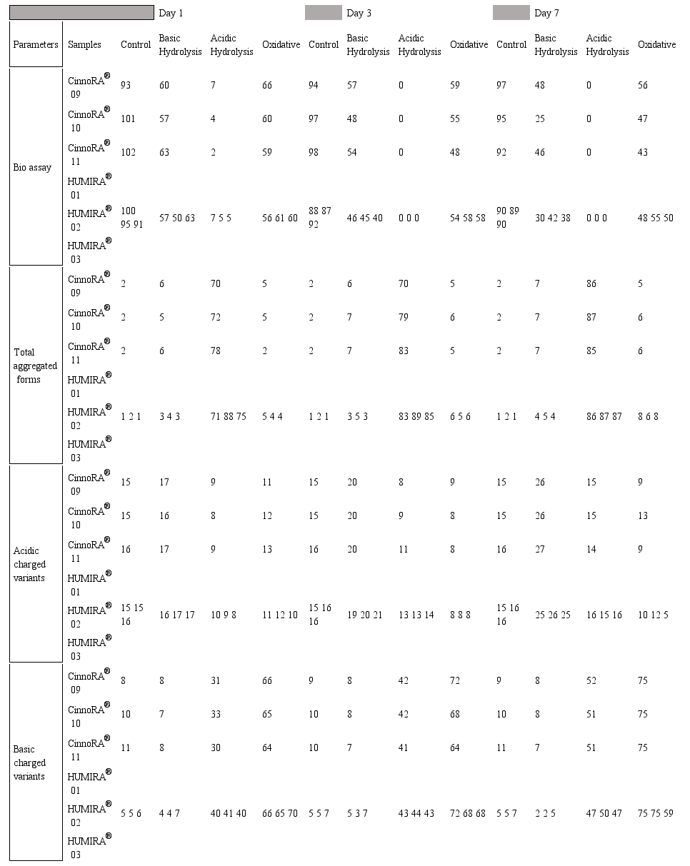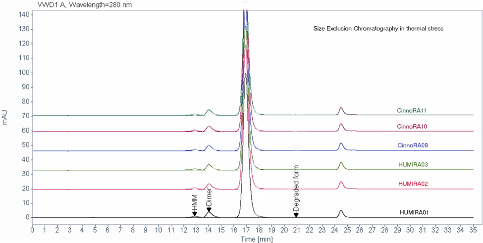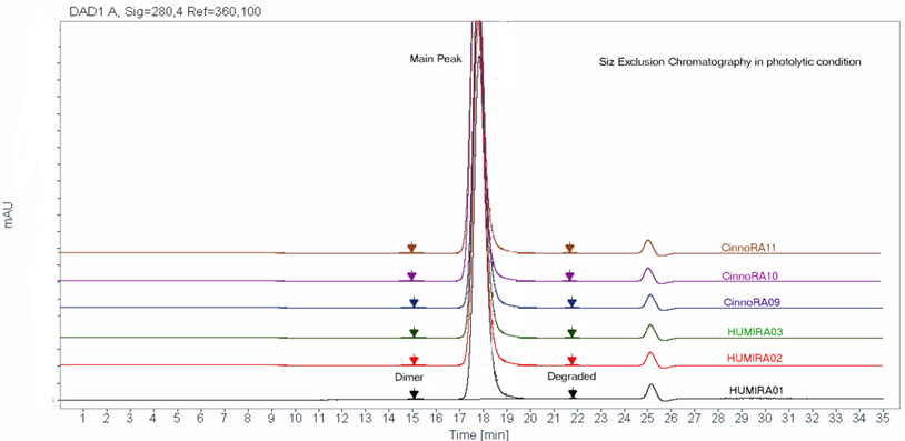 A comprehensive force degradation strategy implemented to assess the similarity between biosimilar and innovator in protein degradation profile. Acidic and basic charged variants, aggregates, biological activities were evaluated and the results support the conclusion that Cinnora® is analytically similar to Humira® under different stress conditions.
