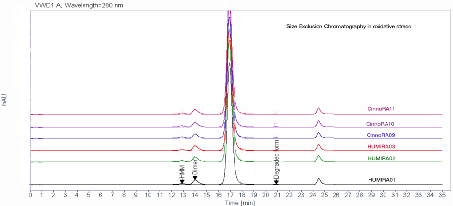 As result of H2O2 exposure to adalimumab exerts its negative impact on the biological activity by increasing aggregate formation which is considerable in table 3. Significant difference between control and sample and similarity in degradation pattern of Cinnora® and Humira® was observed in figures 10,11 and 12.