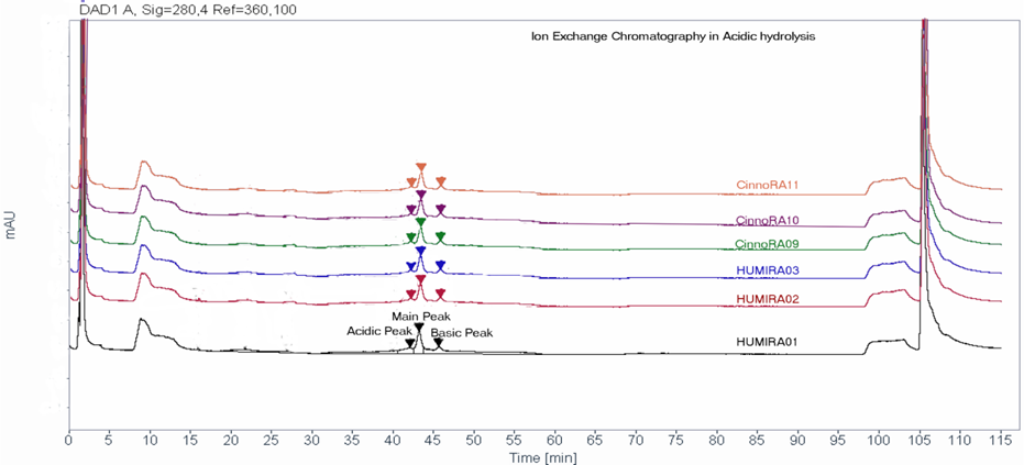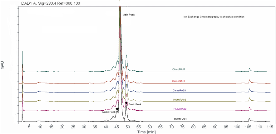 Figure 1: Comparison of acidic and basic charged variants by Ion exchange chromatography in photolysis condition (day 1) between Humira. and Cinnora.. Representative Ion exchange chromatography profile is presented for 3 batches of Cinnora. (09,10,11) and 3 batches of Humira. (01,02,03). This degradation pattern is followed in both day 3 and day 7.