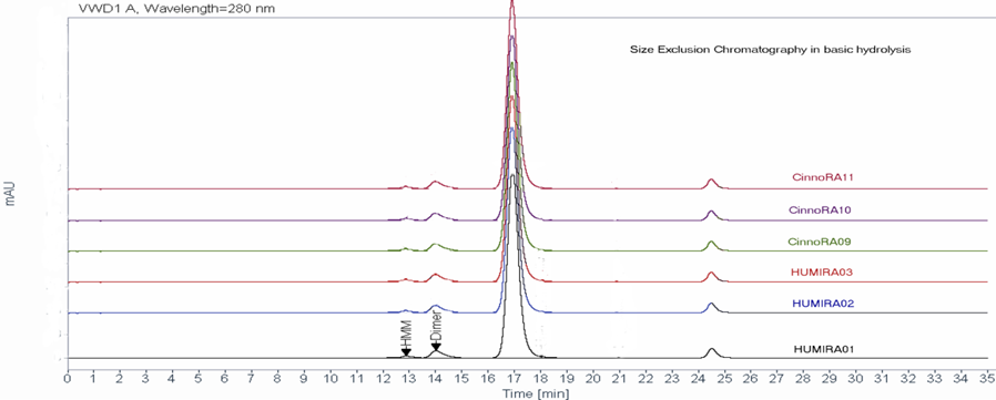 Figure 2: Comparison of total aggregated forms by size exclusion chromatography in photolytic condition (day 1) between Humira. and Cinnora.. Representative Ion exchange chromatography profile is presented for 3 batches of Cinnora. (09,10,11) and 3 batches of Humira. (01,02,03). This degradation pattern is followed in both day 3 and day 7.