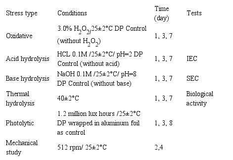 To provide an orthogonal assessment of degradation trends, typically the exposure of drug substance or drug product to the relevant stress conditions of light, heat, humidity, acid/base hydrolysis, and oxidation is involved. The chemical and physical instabilities could disturb tertiary and frequently secondary structure of proteins; formation and/or breakage of covalent bonds in the first order structure of biopharmaceuticals, this conformational and chemical alteration could impair biological activity of biopharmaceuticals and could induce irreversible protein aggregation, oxidation, hydrolysis adsorption, deamidation, unfolding, denaturation, elimination, racemization and disulfide exchange19-21,36,37.