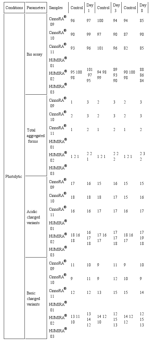 Table 2: The results of bioassay, total aggregated forms and acidic/basic charged variants in the photolytic stress testing are presented. The results are given in each time point (day 1,3,8) beside control samples of cinnora® and Humira®.