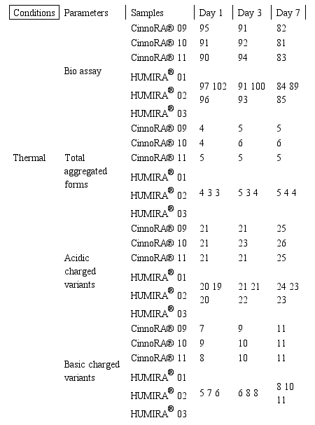 Thermolytic degradation is implemented by 25±2ºC. The results of all batches of Cinnora® and Humira® are given in table 4 also figures 13,14 and 15 illustrate the comparability of all parameters in Cinnora® and Humira®.