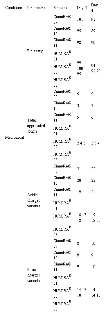 Slightly aggregates increasing was detected in mechanical stress, yet there is no significant difference between day 2 and day 4 (table 5). The result of Cinnora® and Humira® are completely similar and comparable (figure 16, 17 and 18).