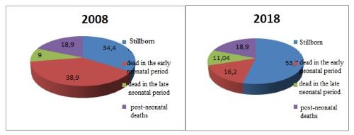 In 2018, the proportion of stillbirths, late neonatal and postneonatal mortality in the structure of fetal and infant losses increased, while the proportion of early neonatal mortality decreased significantly, which indicates a distortion of statistical data (Fig. 3). It should also be noted that the women's health index is growing steadily every year, while in 2018 it amounted to only 71%.