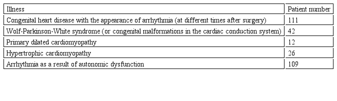 Various disorders of the rhythm of cardiac activity: supraventricular and ventricular localization, tachycardia of a chronic nonparoxysmal type, tachycardia of a paroxysmal type of ventricular localization, the presence of weak sinus node syndrome. This also included children with conduction disorders, in particular with Wolf-Parkinson-White syndrome, as well as with atrio-vetricular blockade of 2-3 degrees. Children in the first group can be divided into 2 subgroups: children with organic changes in the heart (191 people) and children with manifestations of autonomic dysfunction (109). Details of the distribution of each disease are presented in Table 1.