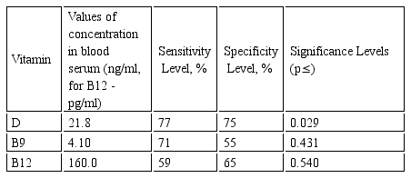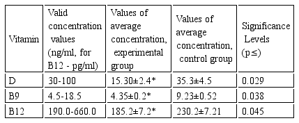 Based on the obtained data on a reduced concentration of vitamins D, B9 and B12 in children from the experimental group and children from the control, the corresponding concentration values of these vitamins were obtained (Table 3).