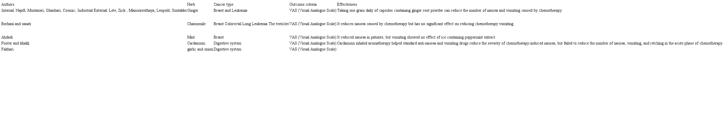 Discussion: According to what was said types of plants as a way to prevent and treat nausea caused by chemotherapy were used to arrange the use of ginger, chamomile, mint, cardamom and garlic and onions were. The following article analyzes will be discussed in relation to their impact. The following table shows some of the details of these studies (Table).