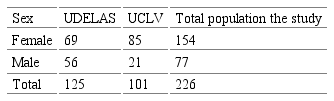 The population studied at the UCLV, the sample selected in the pedagogical faculties was determined to be 101 university teachers. According to sex, the UCLV sample was composed of a greater number of women than men, which makes female representation significant. With respect to work placement, the highest percentage of teachers carry out their work as professors in these faculties and also in Municipal University Centers such as the one in Sagua la Grande, where this line of research is directed and worked at the country level.
