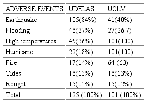 Based on these elements, an in-depth study was carried out with university professors on the information, knowledge, adverse events experienced, as well as the emotional impact of an adverse event on disaster reduction issues in both institutions and selected areas, as well as the adverse events experienced according to the most frequent ones in each country and the emotional impact of an adverse event. The results of the study carried out on the teachers of UDELAS and the pedagogical faculties of the UCLV, are expressed in tables 2, 3 and 4.