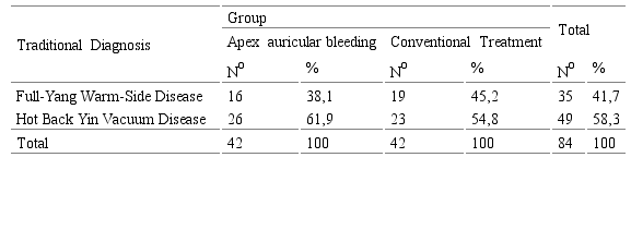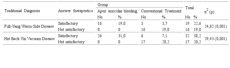 The syndromes found when performing the traditional Chinese diagnosis in both groups are shown in table 3. 58.3% of the total sample presented a hot-back disease due to Yin vacuum and 41.7% a hot-back disease due to Yang fullness. The behavior by groups was similar, predominating in both the first diagnosis referred with 61.9% in the group treated with atrial apex bleeding and 54.8% in the group with conventional treatment. There were no statistically significant differences between the groups in relation to the traditional diagnosis. (p=0,507). In the variables exposed so far, age, sex and traditional diagnosis, there were no significant differences between the groups studied, so they were homogeneous and comparable.