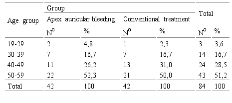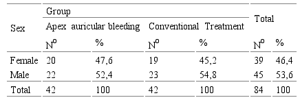 The distribution of the sample patients by sex in both groups is reflected in Table 2. Males represented 53.6% of the sample, with a total of 45 patients. In the group treated with auricular apex bleeding, this sex was represented by 22 cases, for 52.4%, and in the group treated in a conventional manner by 23 patients, for 54.8%. The p value of 0.8268 expresses that there were no statistically significant differences between the groups in relation to the sex of the patients studied.