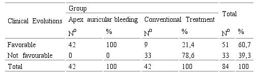 Table 4 shows that 60.7% of the patients studied showed a favourable clinical evolution. Of these, 42 patients in the group were treated with atrial apex bleeding (100%), and nine in the group with conventional treatment (21.4%). In this group, the unfavourable category prevailed, presenting in 78.6% of the patients. These results showed statistically significant differences in clinical evolution between the groups studied. (p=0,001)