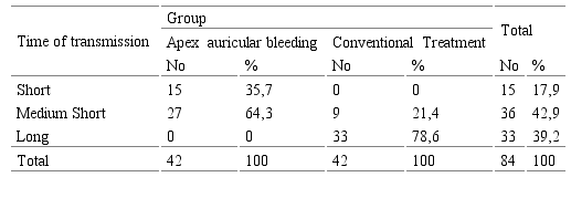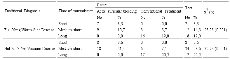 In relation to the traditional diagnosis of hot-back disease by yin vacuum, the median short remission time predominated, with 24 patients for 28.6%. Of these, 21.4% (18 patients) belonged to the group that was bled and 7.1% (6 cases) to the group treated in the conventional way. It should be noted that in this group no patient diagnosed with hot back disease due to yin vacuum remitted their BP figures in a short time and in the group with treatment of bleeding into the apex of the ear no case of both traditional diagnoses remitted their BP figures in a long period. In both traditional diagnoses, there are statistically significant differences in the time of remission when comparing the groups involved in the investigation. (p=0.001 in both)