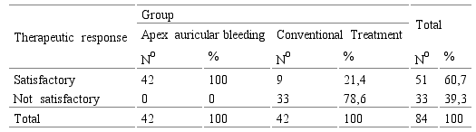 The assessment of the therapeutic response in both groups, shown in Table 8 and Figure 3, reflects that 60.7% of patients presented a satisfactory therapeutic response. In the group treated with atrial apex bleeding, 100% of the patients had this result. In the group with conventional treatment the response was satisfactory in 21.4% of patients and unsatisfactory in 78.6%. The differences were statistically significant in the therapeutic response between the groups studied, taking the p value of 0.000.