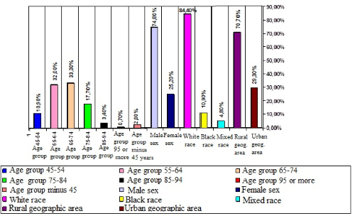 Based on the main general variables studied, the prevalence in the study group of patients between 55 and 74 years of age stands out, for 65% of cumulative frequency; however, 33.3% predominated in the age range 65 and 74 years, although there was very little difference with the age range 55 and 64 years. Male patients with 74.8% tripled their value over female patients (37 cases) in this entity. The white race with 84.4% and the rural area with 70.7% (104 cases) prevailed between half and one third of the total population (147 cases), analysis that is shown in figure 1.